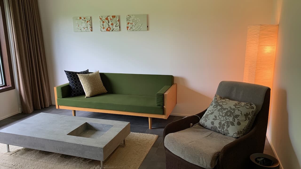 床暖房完備のイタリアデザインタイル床のリビングルーム。目黒通りkarfオリジナルのソファ、天然石のリビングテーブル、パナソニックデザインマッサージチェアをご用意。フィンランド、マリメッコのファブリックアートは北欧テイストのデザイナールームの気分でお楽しみいただけることと思います。リビングからベッドルームへと繋がります。