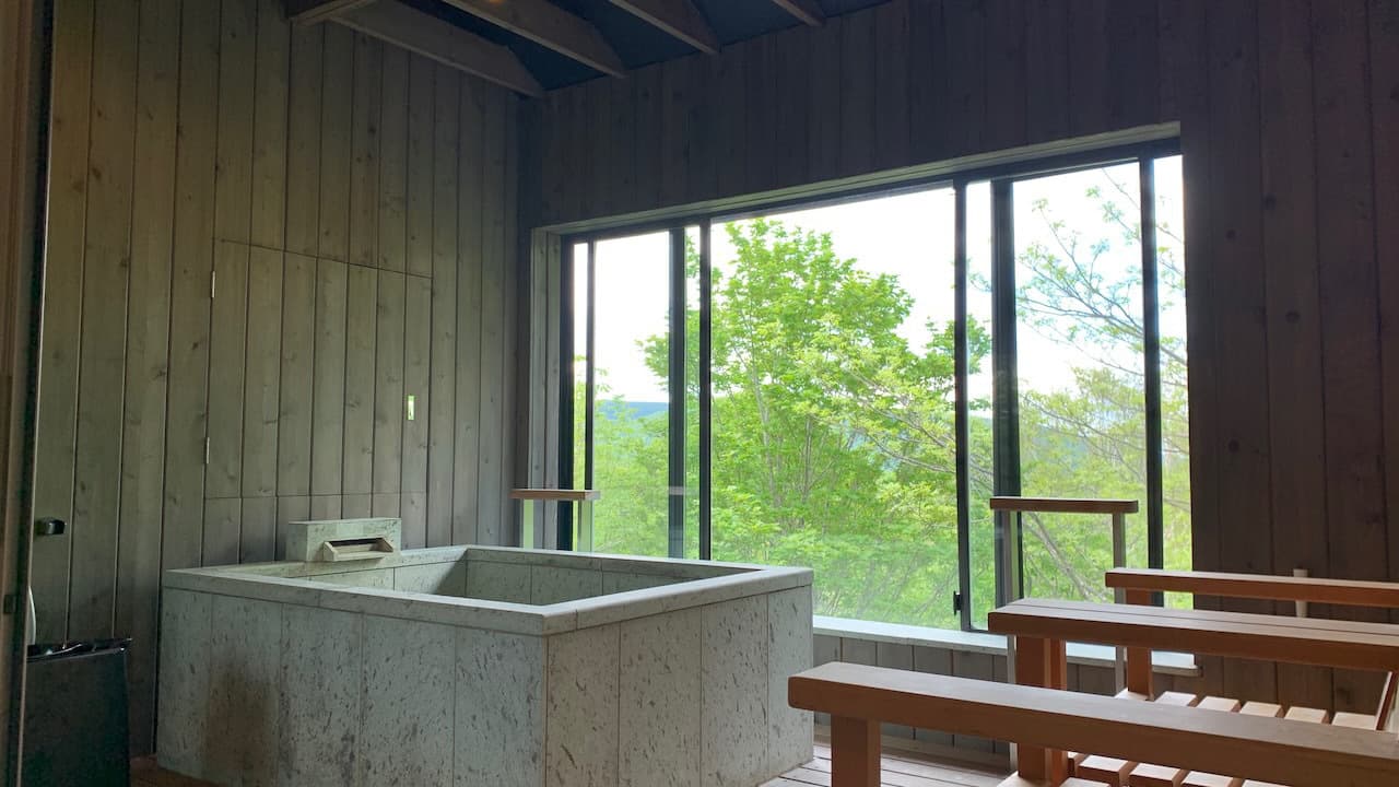奥志賀の森を雄大に望みながらのバスタイム。奥志賀渓谷のグリーンタフを連想する天然石の浴槽をお楽しみいただけます。奥志賀は温泉はございませんが、温泉を彷彿させるマイクロバブルの柔らかい白いお湯になります。