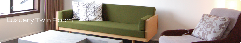 インナーテラスバス、リビングルーム、ベッドルームを備えた新設のラグジュアリーツインルームです。目黒通りカーフのソファ、小布施よしのやの造作リビングボード、奥志賀渓谷を作るグリーンタフと同種の石材で作られる浴槽にはマイクロバブル健康浴のシルキーバスを完備したデザイナーズルーム。