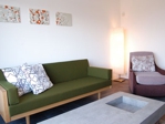 床暖房完備のイタリアデザインタイル床のリビングルーム。目黒通りkarfオリジナルのソファ、天然石のリビングテーブル、パナソニックデザインマッサージチェアをご用意。フィンランド、マリメッコのファブリックアートは北欧テイストのデザイナールームの気分でお楽しみいただけることと思います。リビングからベッドルームへと繋がります。
