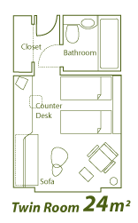 スタンダードツインルーム/バス・トイレ付、2〜3名様でご利用いただけるお部屋です。お部屋の広さは24㎡のシティホテルサイズ。窓側にはリクライニングチェアとテーブルコーナー。北欧スタイルの家具、ファブリックでコーディネートいたしましたインテリアをお楽しみいただけます。4ベッドでご利用できるお部屋も1室ご用意しております。